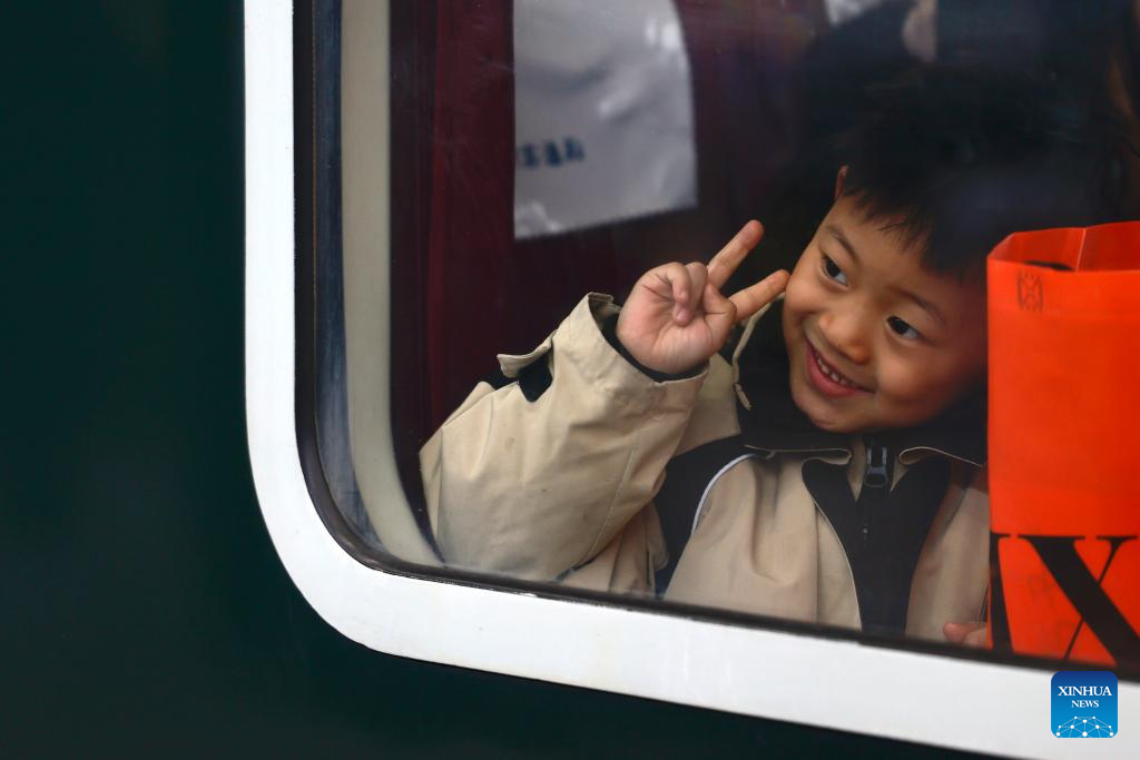 A boy gestures aboard train T258 from Urumqi, northwest China's Xinjiang Uygur Autonomous Region, to Lanzhou, northwest China's Gansu Province, Jan. 14, 2025. The Spring Festival, China's biggest traditional holiday, will fall on Jan. 29 this year. The Spring Festival travel rush, or chunyun, the world's largest annual human migration known for its high transportation demand as millions return home for family reunions, kicked off on Tuesday. (Xinhua/Chen Shuo)
