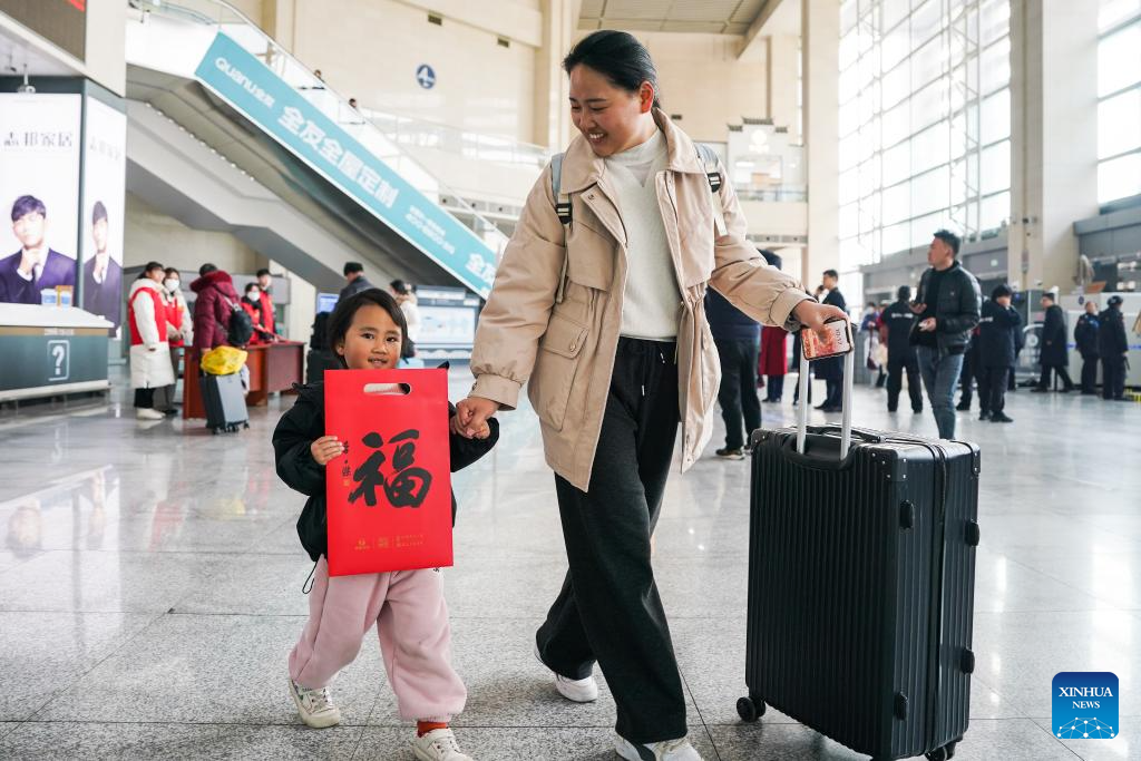 Travelers walk in Hefei Railway Station in Hefei, east China's Anhui Province, Jan. 14, 2025. The Spring Festival, China's biggest traditional holiday, will fall on Jan. 29 this year. The Spring Festival travel rush, or chunyun, the world's largest annual human migration known for its high transportation demand as millions return home for family reunions, kicked off on Tuesday. (Xinhua/Du Yu)