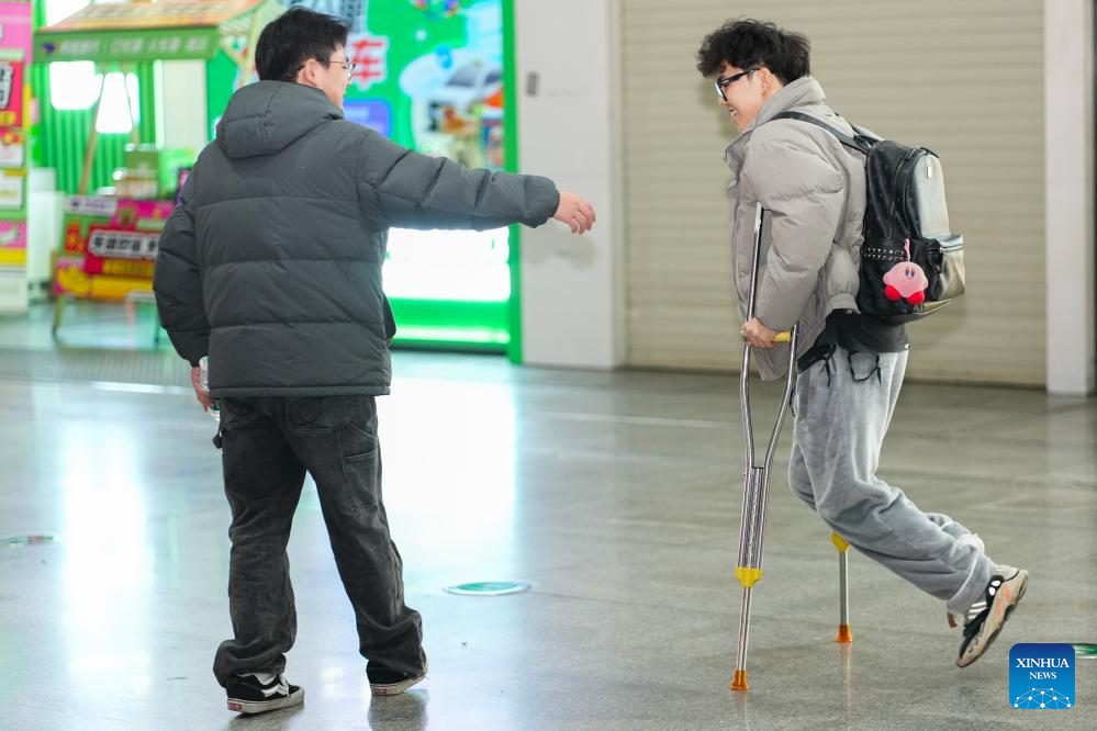A man greets his friends at the exit of Changsha South Railway Station in Changsha, central China's Hunan Province, Jan. 14, 2025. The Spring Festival, China's biggest traditional holiday, will fall on Jan. 29 this year. The Spring Festival travel rush, or chunyun, the world's largest annual human migration known for its high transportation demand as millions return home for family reunions, kicked off on Tuesday. (Xinhua/Chen Zeguo)