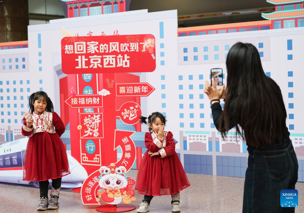 Two kids pose for a photo with a Spring Festival decoration in Beijing West Railway Station in Beijing, capital of China, Jan. 14, 2025. The Spring Festival, China's biggest traditional holiday, will fall on Jan. 29 this year. The Spring Festival travel rush, or chunyun, the world's largest annual human migration known for its high transportation demand as millions return home for family reunions, kicked off on Tuesday. (Xinhua/Fan Yuqing)