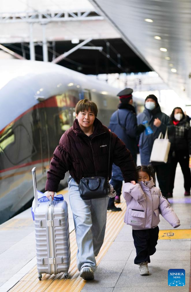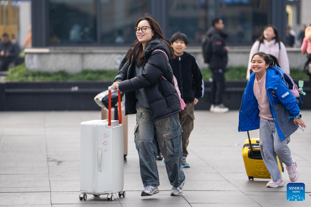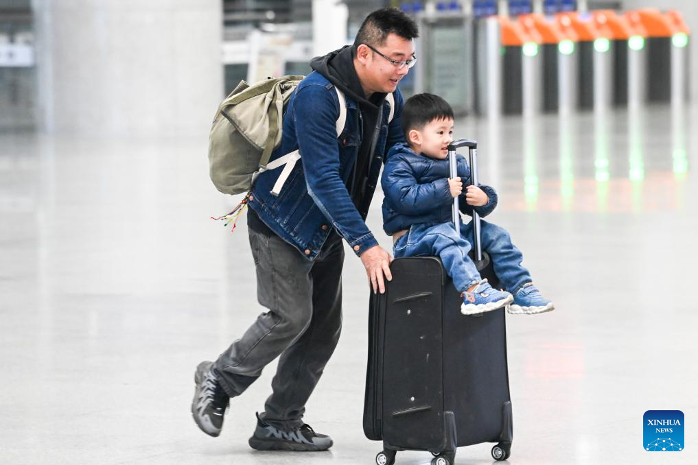 A family is pictured at Chongqing West Railway Station in southwest China's Chongqing Municipality, Jan. 14, 2025. The Spring Festival, China's biggest traditional holiday, will fall on Jan. 29 this year. The Spring Festival travel rush, or chunyun, the world's largest annual human migration known for its high transportation demand as millions return home for family reunions, kicked off on Tuesday. (Xinhua/Wang Quanchao)