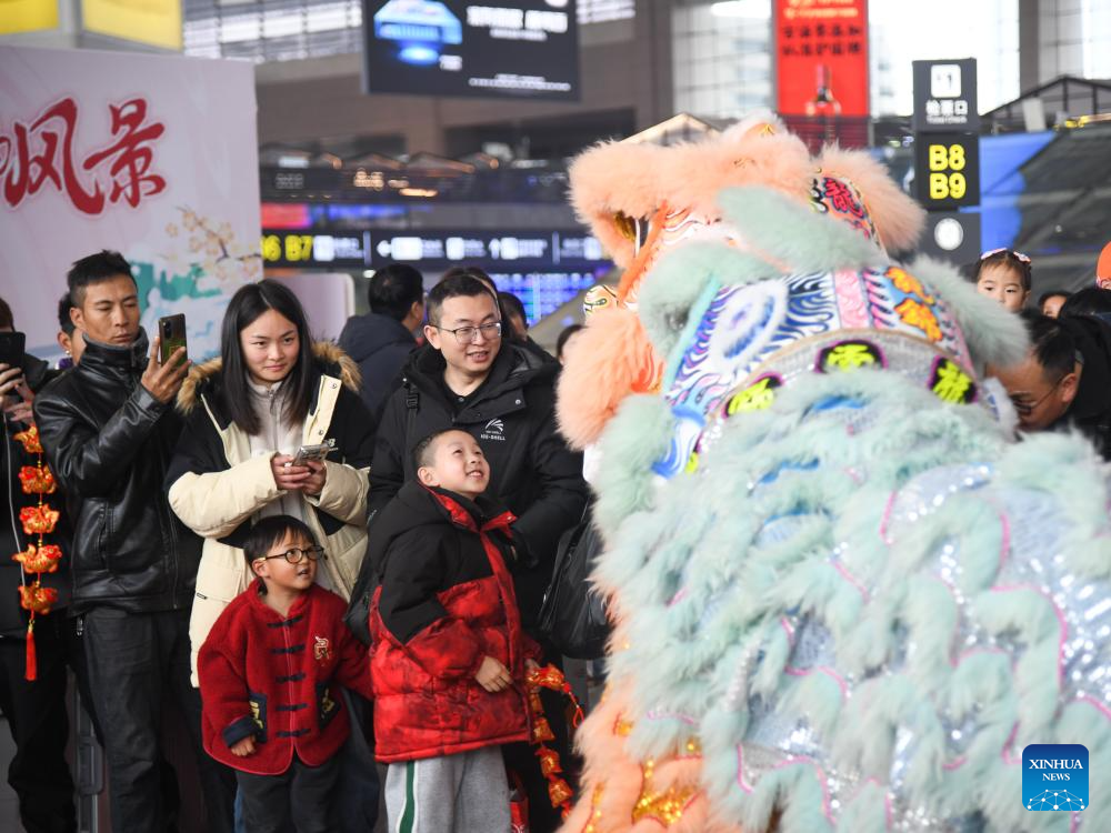 Travelers watch a lion dance performance at Chengdu East Railway Station in Chengdu, southwest China's Sichuan Province, Jan. 14, 2025. The Spring Festival, China's biggest traditional holiday, will fall on Jan. 29 this year. The Spring Festival travel rush, or chunyun, the world's largest annual human migration known for its high transportation demand as millions return home for family reunions, kicked off on Tuesday. (Xinhua/Wang Xi)