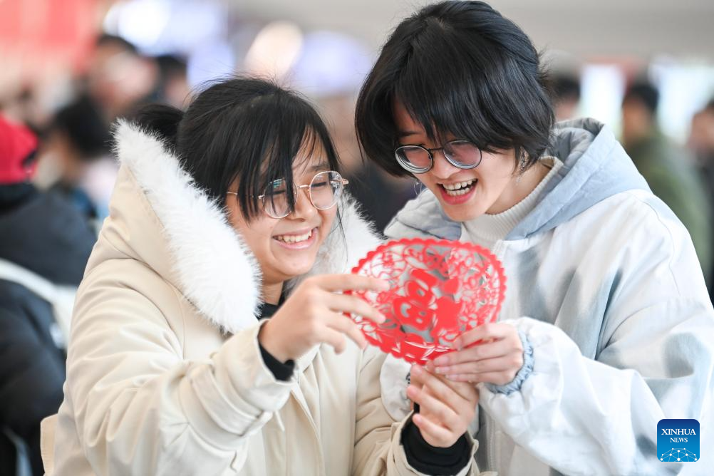 Two college students returning home try paper-cutting at Nanning East Railway Station in Nanning, south China's Guangxi Zhuang Autonomous Region, Jan. 14, 2025. The Spring Festival, China's biggest traditional holiday, will fall on Jan. 29 this year. The Spring Festival travel rush, or chunyun, the world's largest annual human migration known for its high transportation demand as millions return home for family reunions, kicked off on Tuesday. (Xinhua/Cao Yiming)