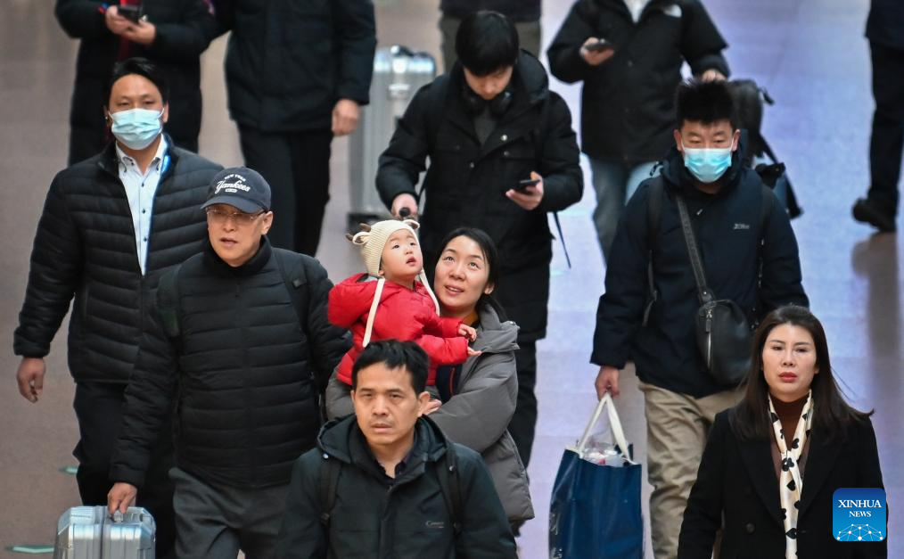 Travelers walk in Beijing West Railway Station in Beijing, capital of China, Jan. 14, 2025. The Spring Festival, China's biggest traditional holiday, will fall on Jan. 29 this year. The Spring Festival travel rush, or chunyun, the world's largest annual human migration known for its high transportation demand as millions return home for family reunions, kicked off on Tuesday. (Xinhua/Du Zixuan)