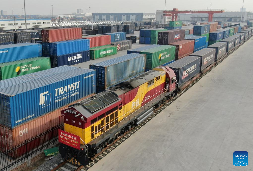 A China-Europe freight train arrives at the Xi'an Chanba International Port in Xi'an, northwest China's Shaanxi Province, Jan. 10, 2025.