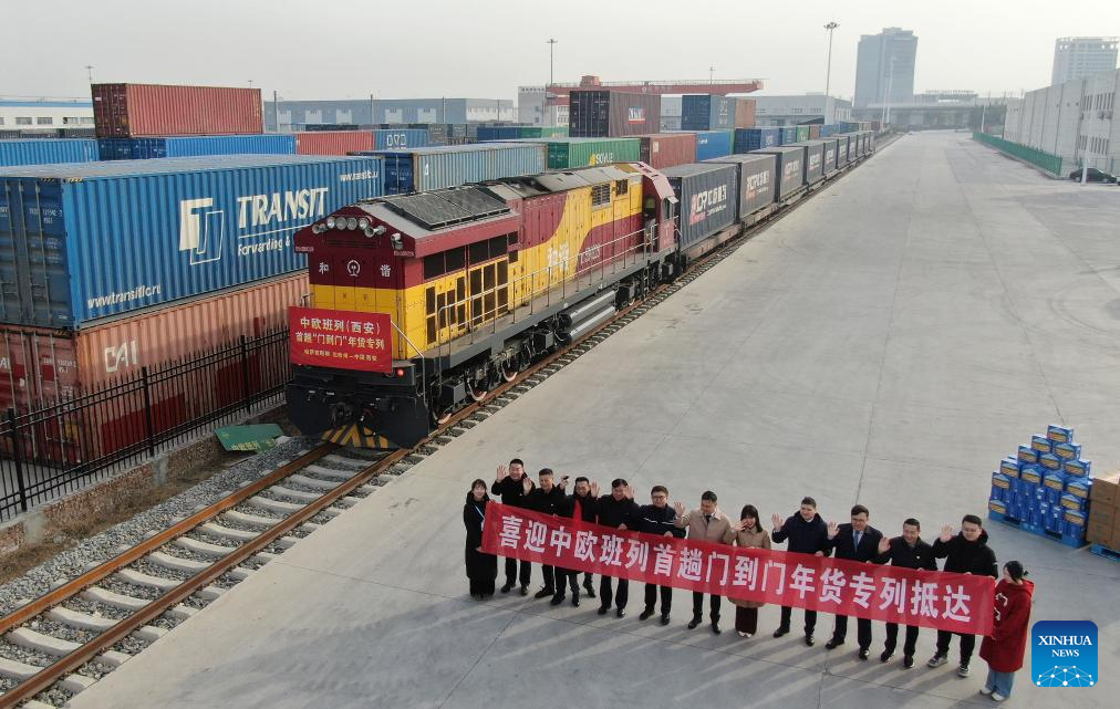 A China-Europe freight train loaded with 1,300 tonnes of flour products from Kazakhstan arrived here on Friday, marking the first inbound China-Europe freight train carrying goods for the Spring Festival to Xi'an. (Xinhua/Li Yibo)
