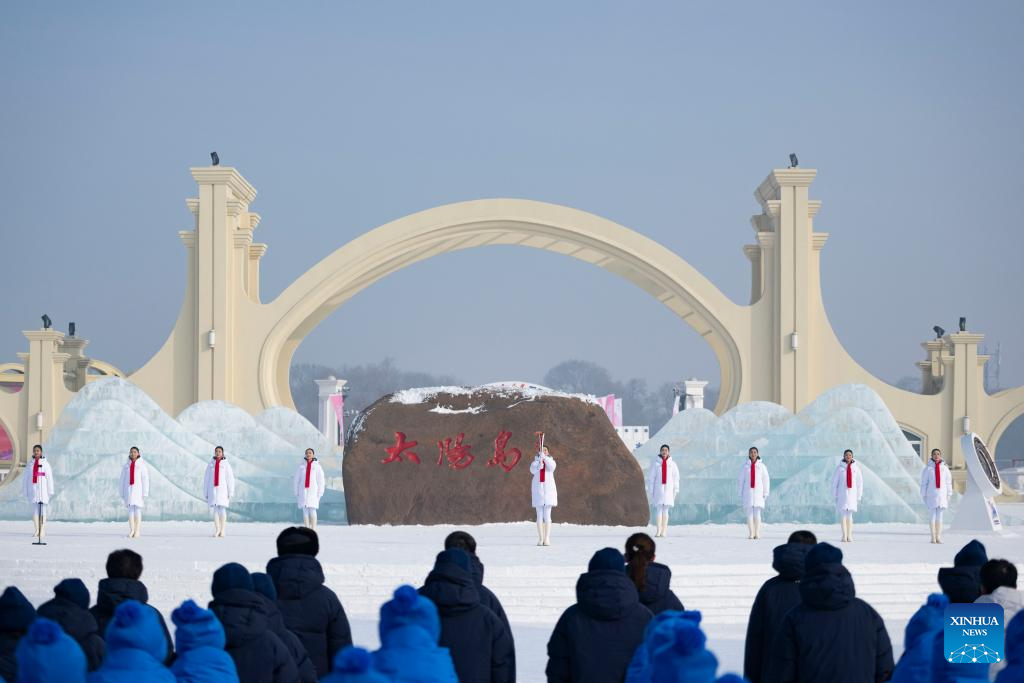 Photo taken on Jan. 20, 2025 shows the flame lighting ceremony for the Harbin 2025 Asian Winter Games at the Sun Island Scenic Area in Harbin, northeast China's Heilongjiang Province. (Xinhua/Wang Song)