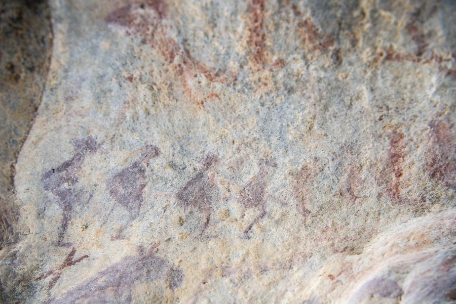 This photo taken on Jan. 14, 2019 shows a rock painting depicting early humans skiing on fur-covered wooden skis while hunting with poles in Handgait township in Altay Prefecture, northwest China's Xinjiang Uygur Autonomous Region. (Xinhua/Hu Huhu)