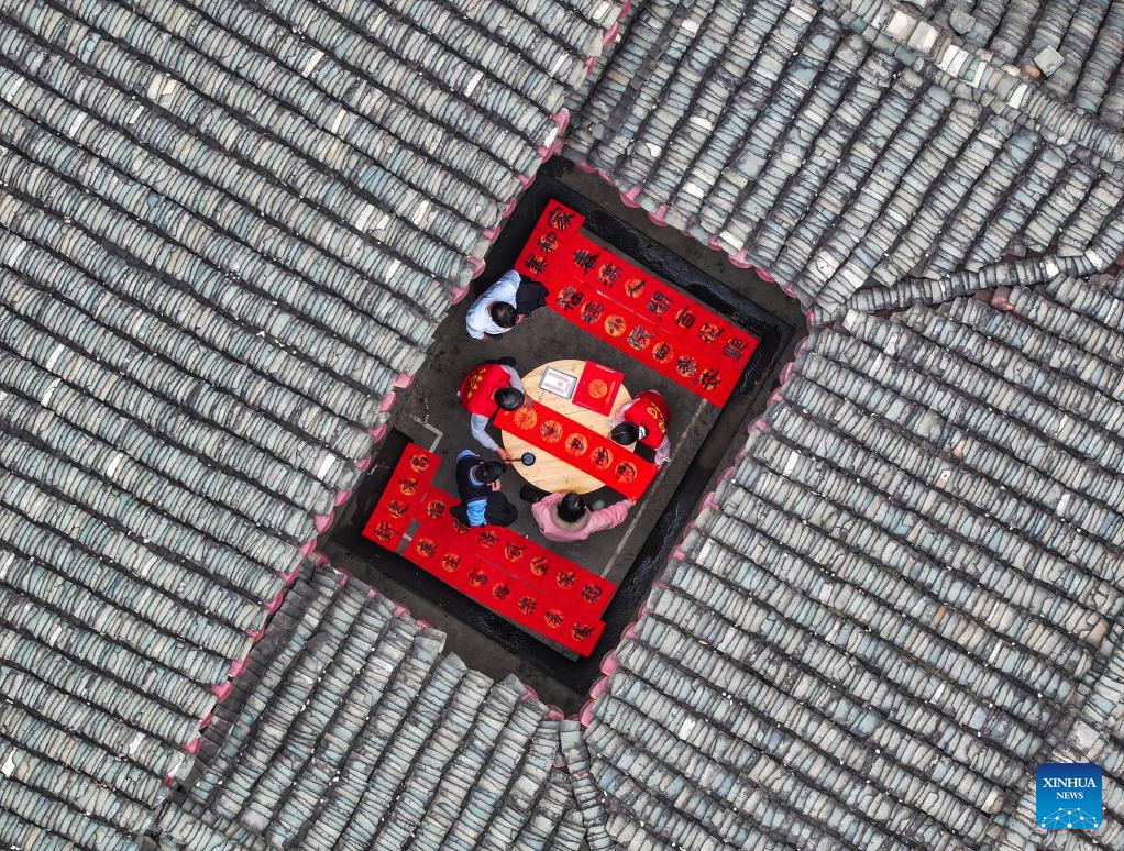 An aerial drone photo taken on Jan. 22, 2025 shows people writing Spring Festival couplets in Guitou Village of Daoxian County in Yongzhou City, central China's Hunan Province.