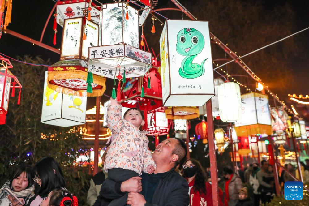 Tourists enjoy a handmade lantern show in Longxi County of Dingxi City, northwest China's Gansu Province, Jan. 22, 2025.