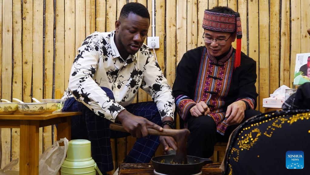 A student from Guinea (L) experiences making Gongcheng oil tea at Yucai campus of Guangxi Normal University in Guilin City of south China's Guangxi Zhuang Autonomous Region, Jan. 23, 2025.