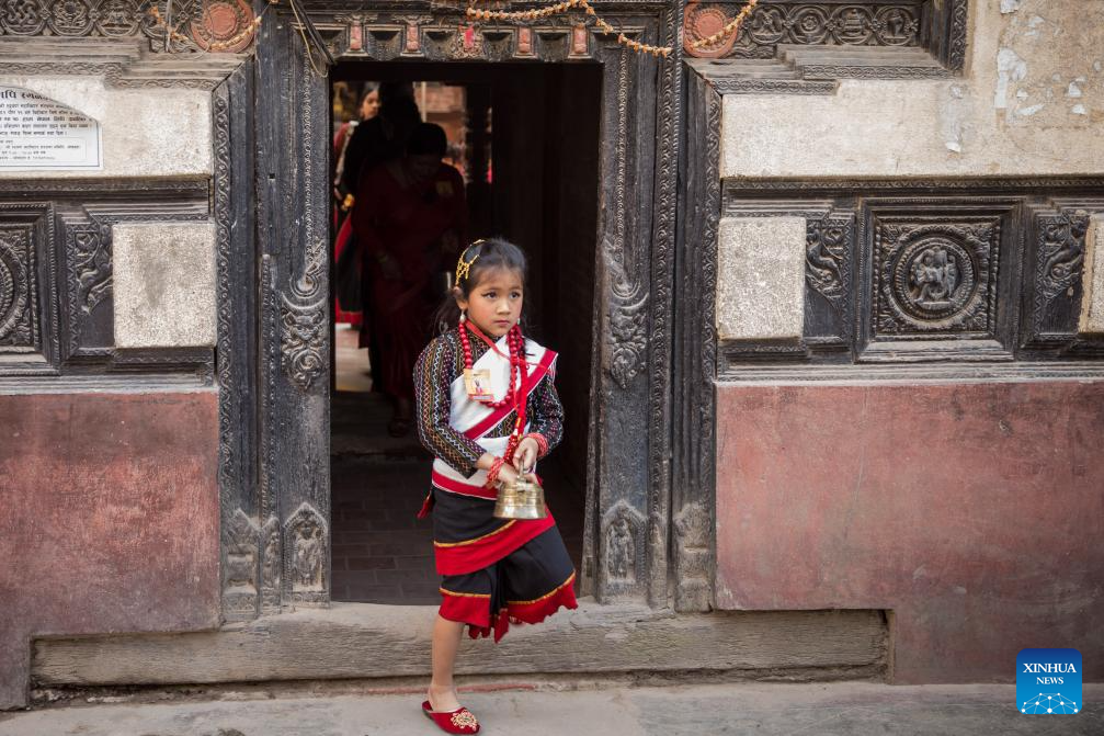 A girl in festive attire from Newari community is about to attend a parade celebrating the Bhimsen Puja festival in Lalitpur, Nepal, Feb. 9, 2025. (Photo by Hari Maharjan/Xinhua)