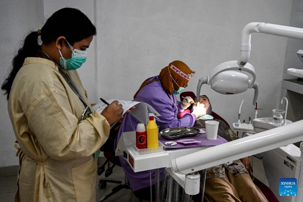A woman undergoes a health screening on the first day of the Free Health Check (CKG) program at Ciater Community Health Center in South Tangerang, Banten Province, Indonesia, Feb. 10, 2025. Indonesia launched the Free Health Check (CKG) program on Monday as a national initiative to improve public health quality and reduce preventable diseases. (Xinhua/Agung Kuncahya B.)