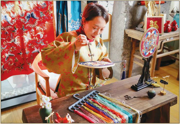 Liu Xiaoyan, an expert in "Beijing embroidery" and inheritor of the art form that has been recognized as an intangible cultural heritage of the nation, works in her Beijing studio on Jan 16. [Photo by Lu Tianyue/For China Daily]