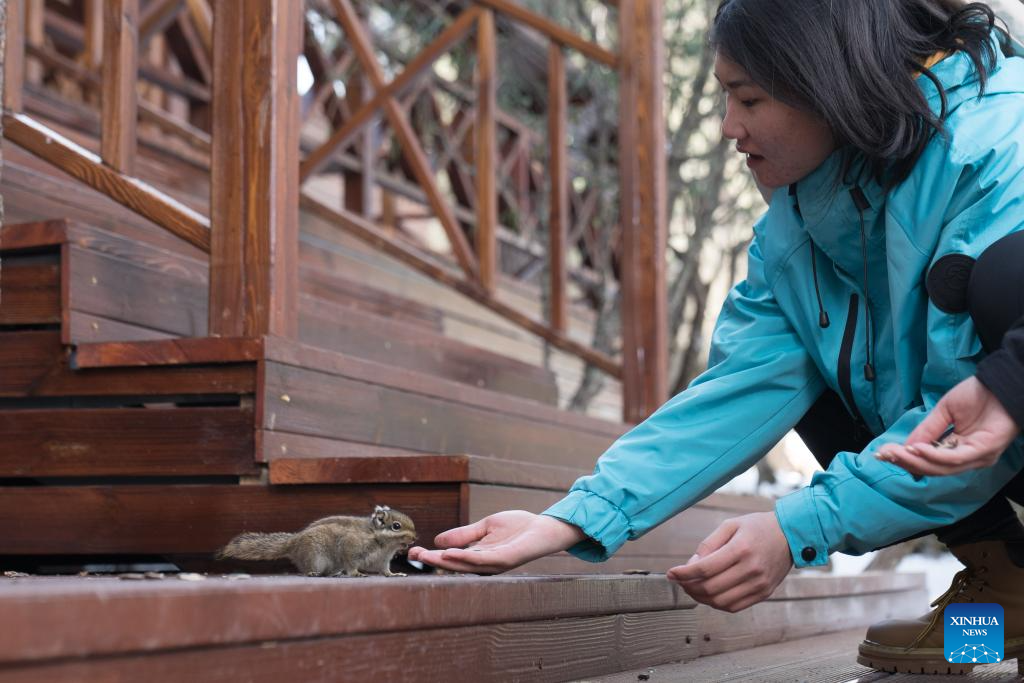 Tourist feed a squirrel at Potatso National Park in Deqen Tibetan Autonomous Prefecture, southwest China's Yunnan Province, Feb. 23, 2025. (Photo by Peng Yikai/Xinhua)