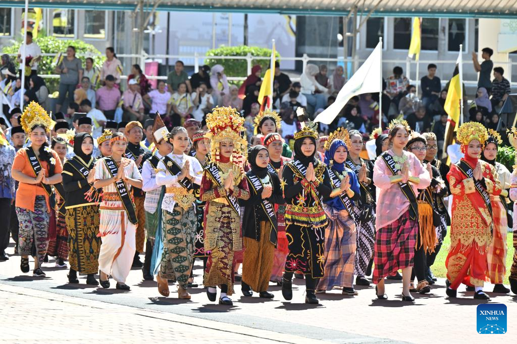 People celebrate the 41st anniversary of Brunei's independence in Bandar Seri Begawan, Brunei, Feb. 23, 2025. Brunei celebrated the 41st anniversary of its independence on Sunday with grand festivities, including a National Day parade and mass gatherings attended by nearly 20,000 people. During the National Day parade, 42 Chinese and Bruneian employees from Hengyi Industries Sdn. Bhd., a China-Brunei joint venture, formed a dedicated parade team, marching alongside representative teams from all walks of life in Brunei. (Photo by Wong Chee Peng/ Xinhua)