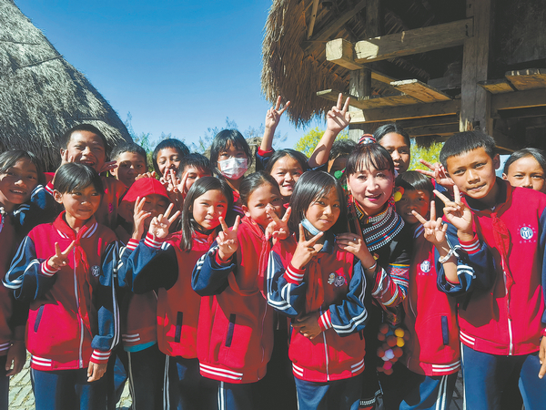 Li Naluo poses with students after a training session in a village in Yunnan province. CHINA DAILY