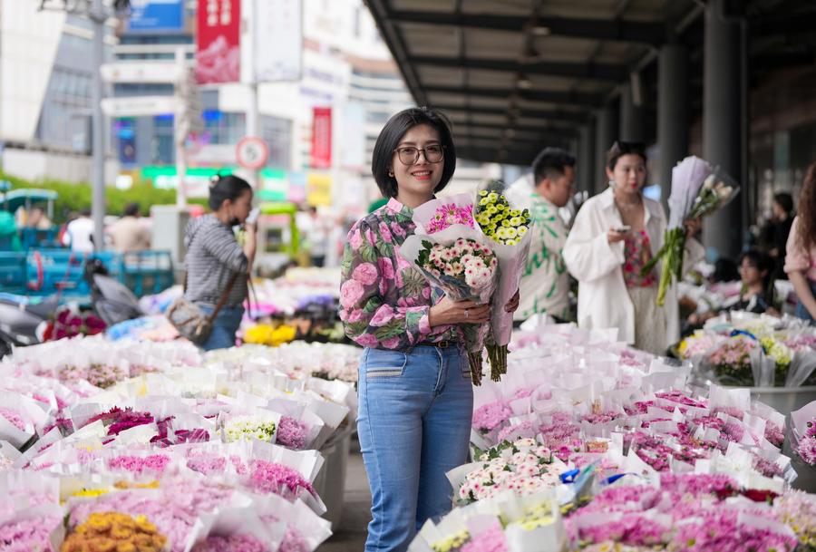 A woman buys flowers at Quang Ba Flower Market in Hanoi, Vietnam, March 28, 2025. (Xinhua/Zhu Wei)