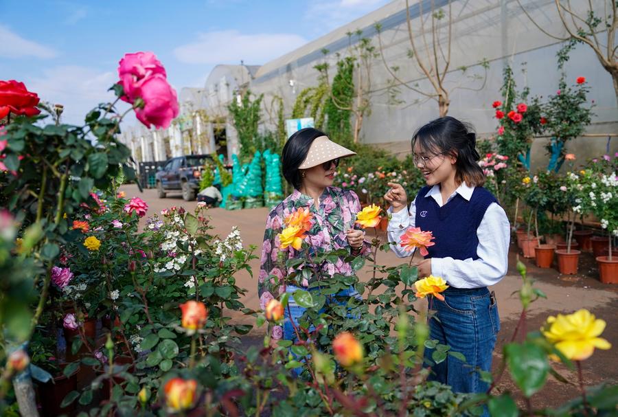 Vietnamese florist Nguyen Thuy Van (L) and her translator Li Qingge check the quality of flowers at a flower base in Kunming, southwest China's Yunnan Province, April 11, 2025. (Xinhua/Chen Xinbo)