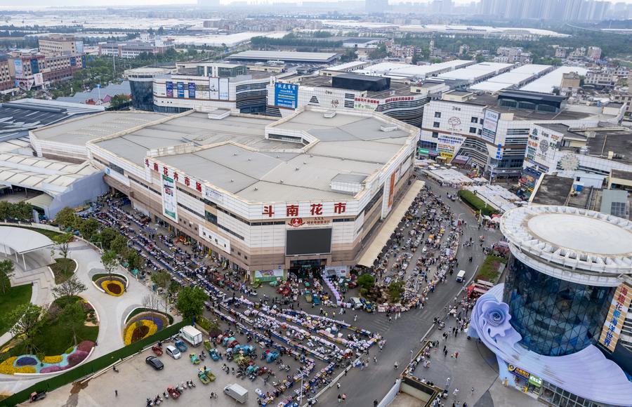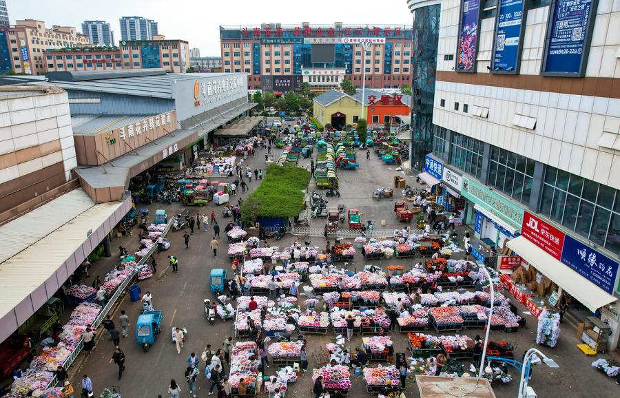 An aerial drone photo shows florists selling flowers at Dounan Flower Market in Kunming, southwest China's Yunnan Province, April 11, 2025. (Xinhua/Chen Xinbo)