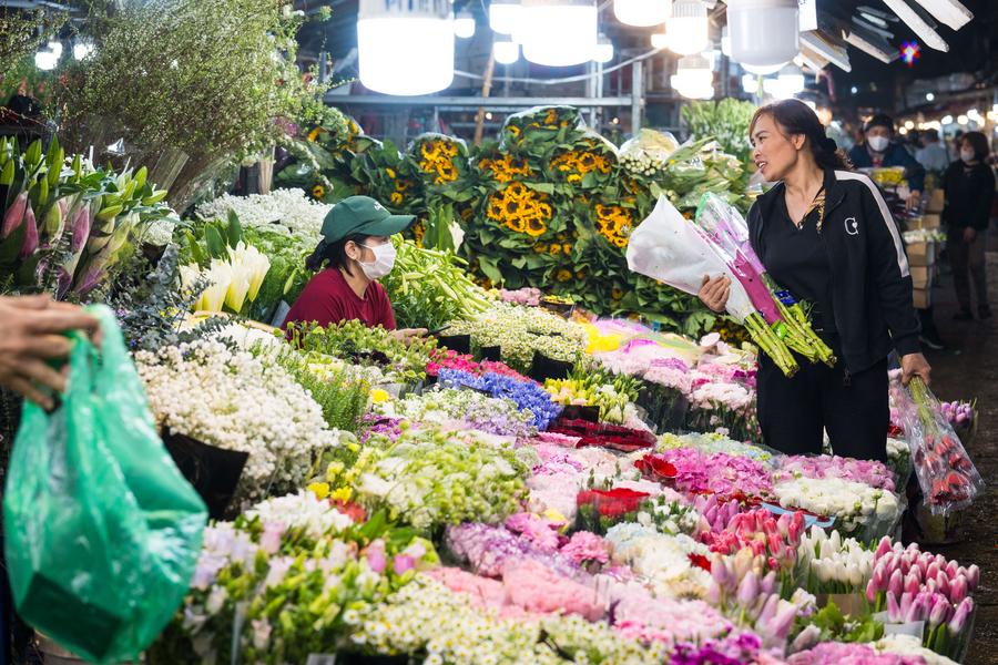 A vendor arranges flowers from China's Yunnan Province at Quang Ba Flower Market in Hanoi, Vietnam, March 28, 2025. (Xinhua/Zhu Wei)