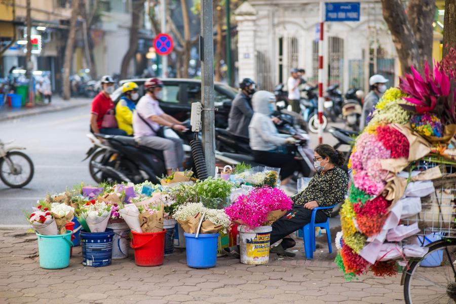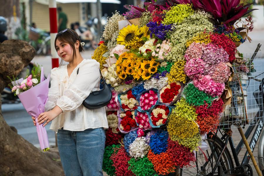 A vendor sells flowers on the street of Hanoi, Vietnam, March 25, 2025. (Xinhua/Zhu Wei)