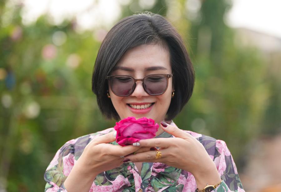 Vietnamese florist Nguyen Thuy Van smells flowers at a flower base in Kunming, southwest China's Yunnan Province, April 11, 2025. (Xinhua/Chen Xinbo)