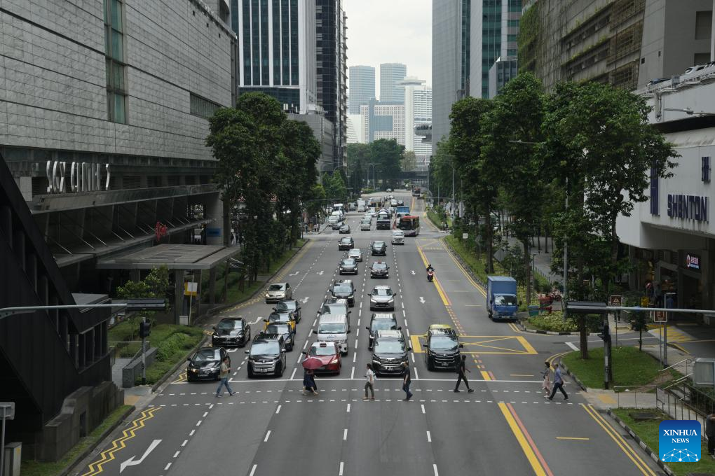 People walk across the road in the financial business district of Singapore, April 14, 2025. Singapore's economy expanded by 3.8 percent year-on-year in the first quarter of 2025, according to advance estimates released by the Ministry of Trade and Industry on Monday. (Xinhua/Then Chih Wey)