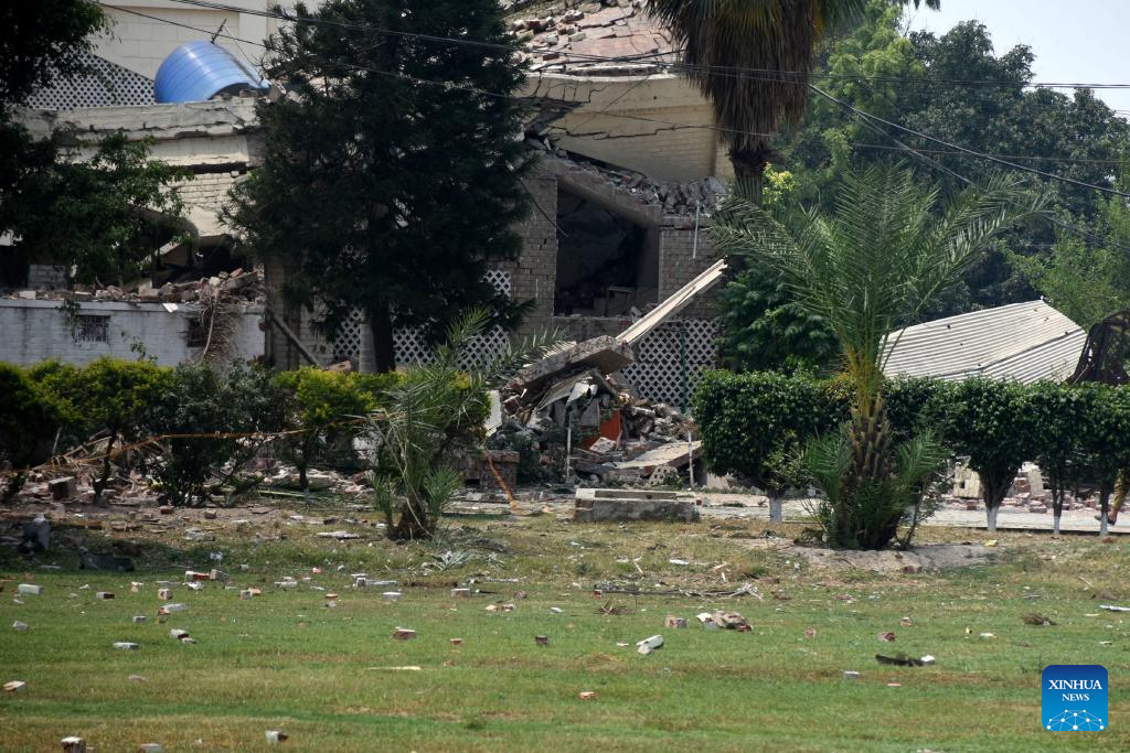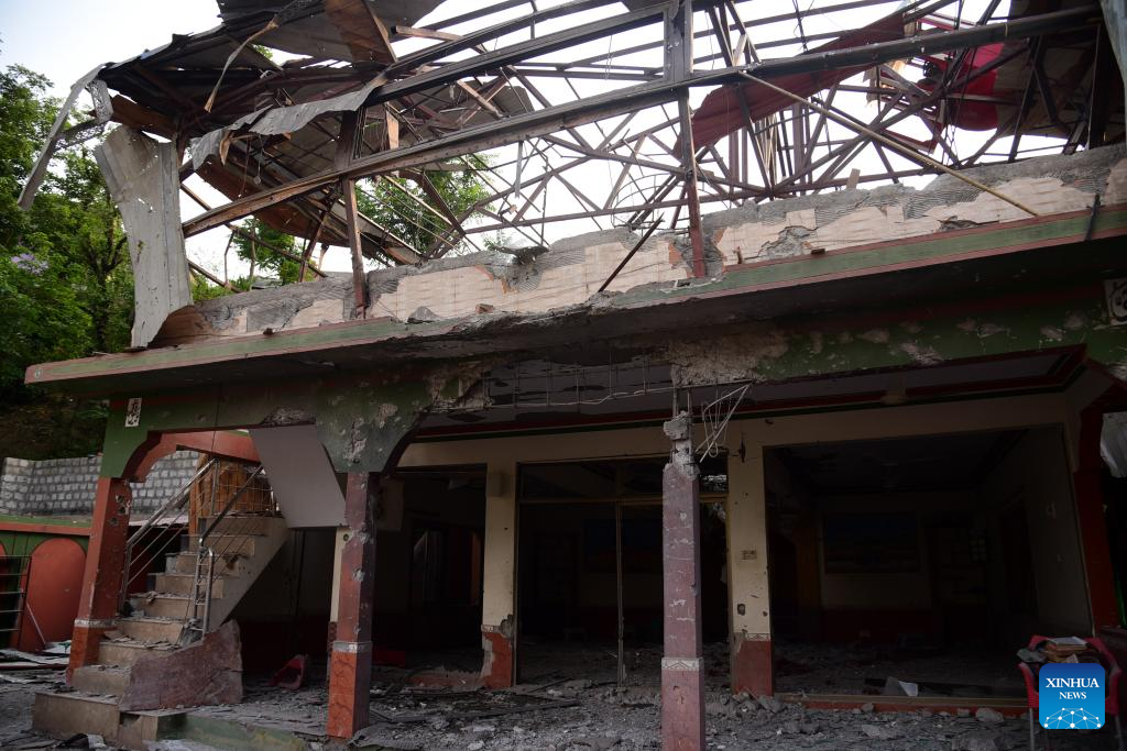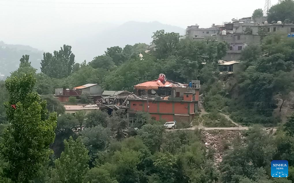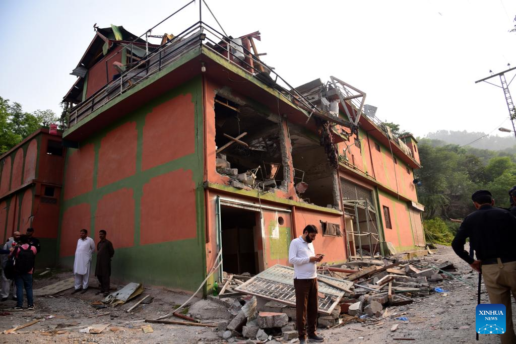 Photo taken on May 7, 2025 shows a building damaged in an Indian missile attack in Muzaffarabad, Pakistan-controlled Kashmir. Twenty-six people, including women and children, were killed and 46 others injured when India attacked civilian settlements in six areas of Pakistan on Tuesday night and Wednesday morning, a spokesperson for the Pakistani army's media wing said. (Photo by Muhammad Din Mughal/Xinhua)