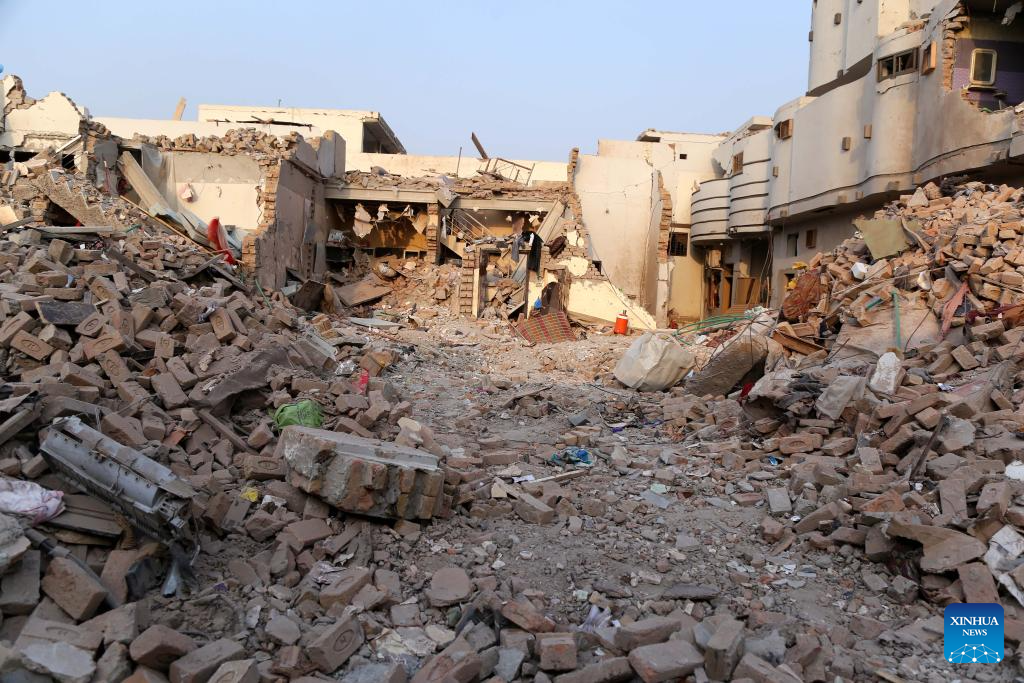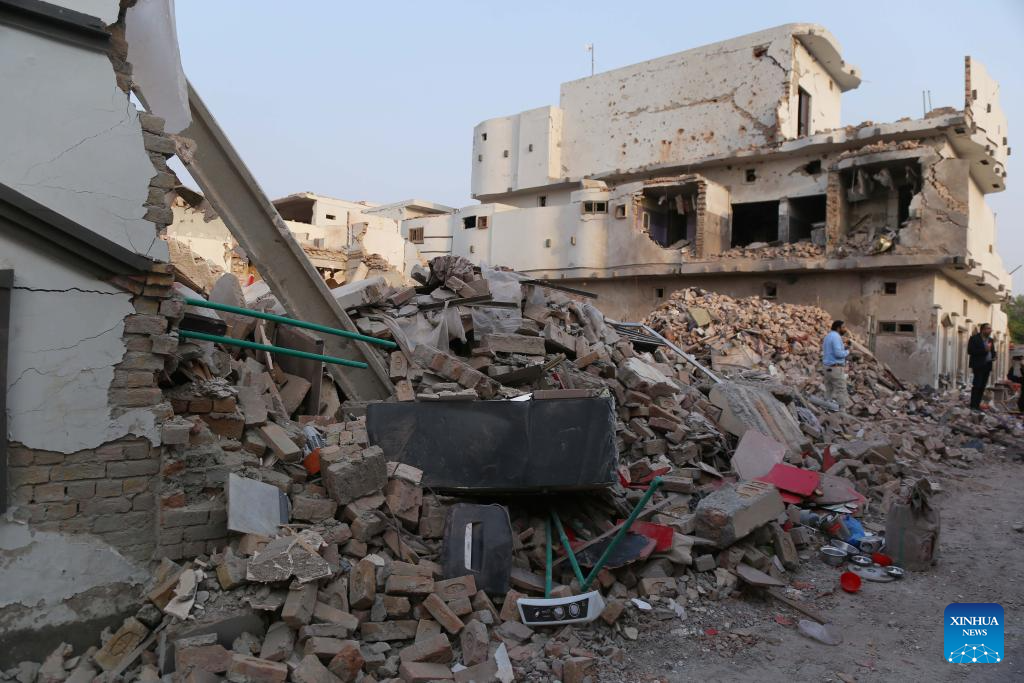 This photo taken with mobile phone shows a building destroyed in an Indian missile strike in Muridke, a town near Lahore, Pakistan on May 7, 2025. Twenty-six people, including women and children, were killed and 46 others injured when India attacked civilian settlements in six areas of Pakistan on Tuesday night and Wednesday morning, a spokesperson for the Pakistani army's media wing said. (Xinhua/Jamil Bhatti)