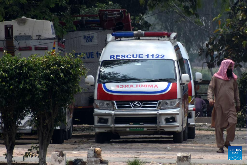 An ambulance is seen near destroyed buildings after an Indian missile attack in Muridke, a town near Lahore, Pakistan on May 7, 2025. Twenty-six people, including women and children, were killed and 46 others injured when India attacked civilian settlements in six areas of Pakistan on Tuesday night and Wednesday morning, a spokesperson for the Pakistani army's media wing said. (Photo by Sajjad/Xinhua)
