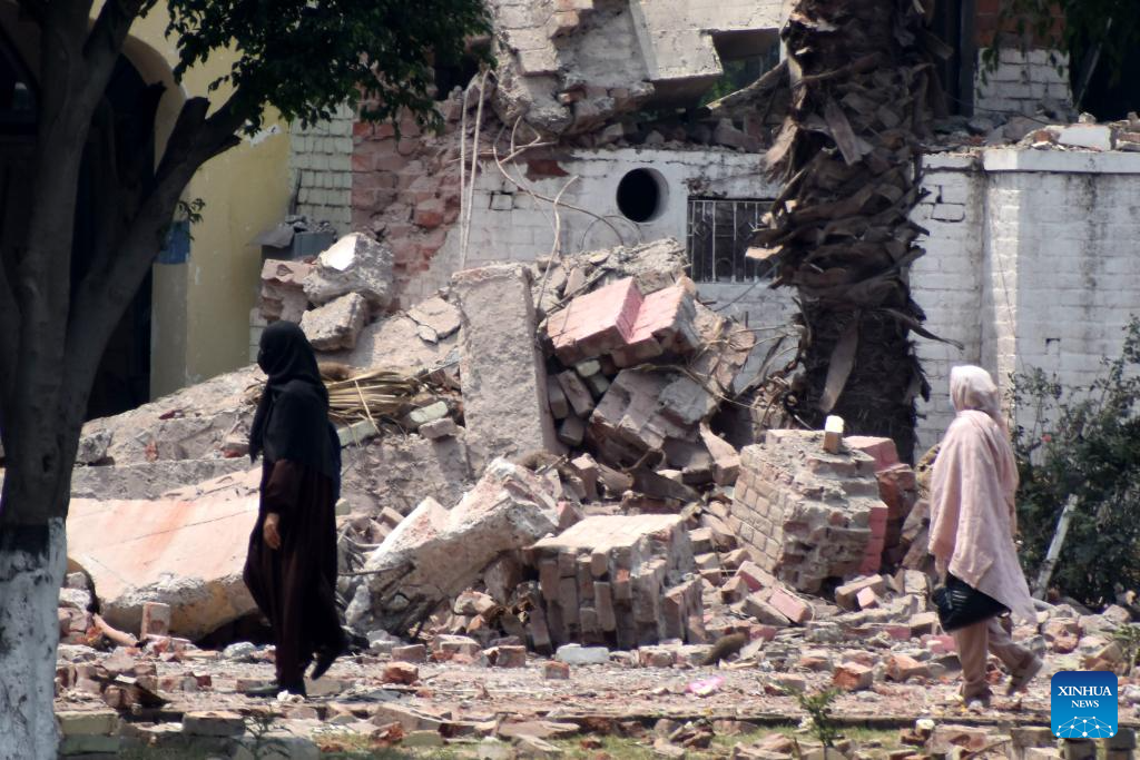 People walk through rubble of a destroyed building after an Indian missile attack in Muridke, a town near Lahore, Pakistan on May 7, 2025. Twenty-six people, including women and children, were killed and 46 others injured when India attacked civilian settlements in six areas of Pakistan on Tuesday night and Wednesday morning, a spokesperson for the Pakistani army's media wing said. (Photo by Sajjad/Xinhua)