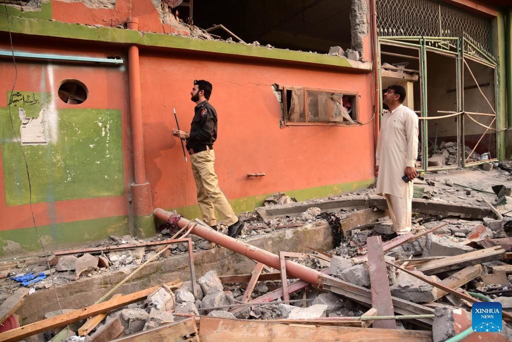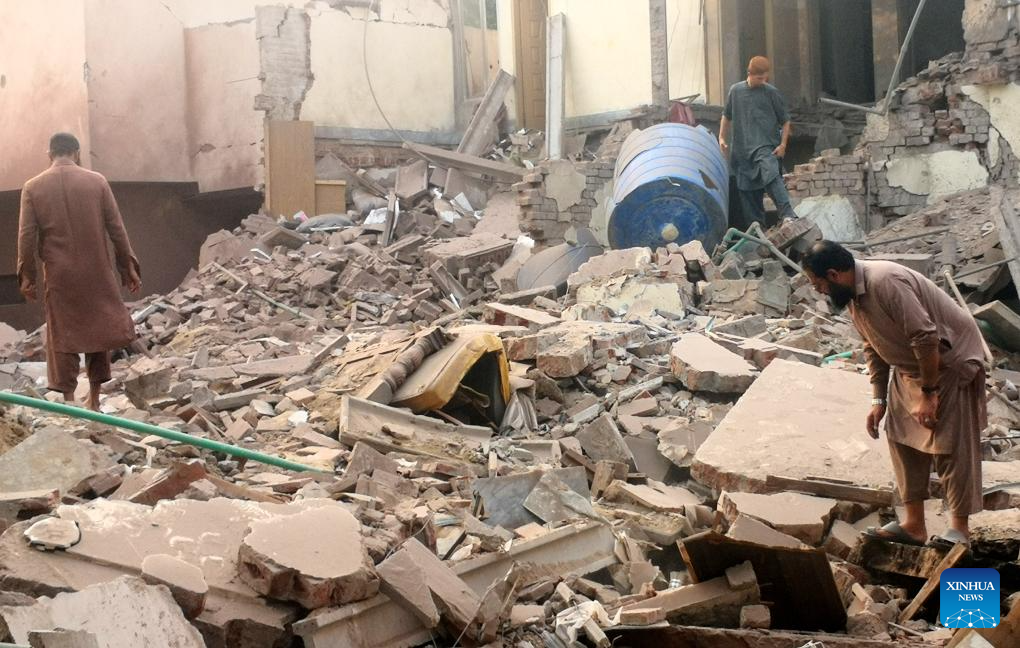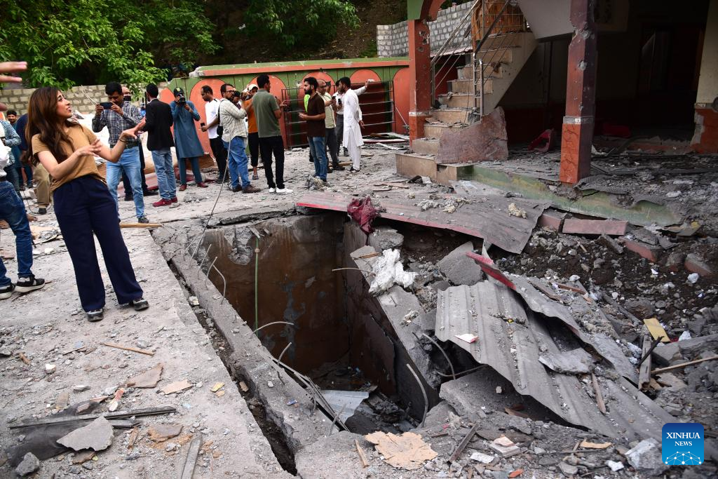 People inspect the damage of an Indian missile attack in Muzaffarabad, Pakistan-controlled Kashmir, on May 7, 2025. Twenty-six people, including women and children, were killed and 46 others injured when India attacked civilian settlements in six areas of Pakistan on Tuesday night and Wednesday morning, a spokesperson for the Pakistani army's media wing said. (Photo by Muhammad Din Mughal/Xinhua)