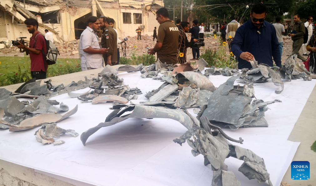 This photo taken with mobile phone shows fragments of Indian missiles displayed near damaged buildings in Muridke, a town near Lahore, Pakistan on May 7, 2025. Twenty-six people, including women and children, were killed and 46 others injured when India attacked civilian settlements in six areas of Pakistan on Tuesday night and Wednesday morning, a spokesperson for the Pakistani army's media wing said. (Xinhua/Jamil Bhatti)