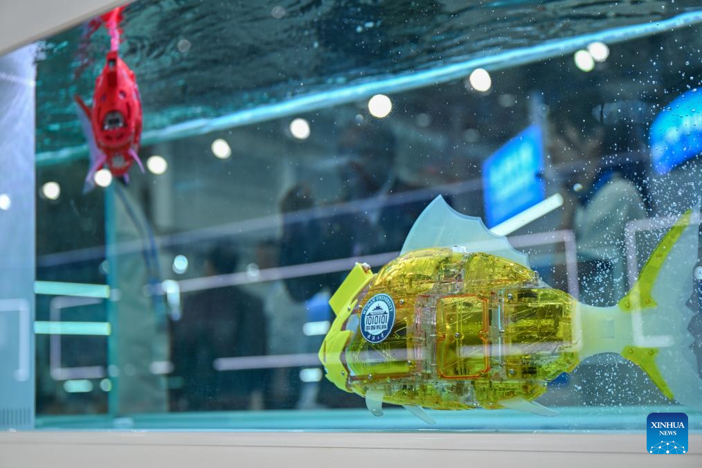 This photo taken on May 14, 2025 shows AI-powered robotic fish displayed at the Digital Education Achievements Exhibition of the 2025 World Digital Education Conference in Wuhan, central China's Hubei Province. Under the theme of "Education Development and Transformation: The Era of Intelligence," the 2025 World Digital Education Conference opened here on Tuesday. (Xinhua/Du Zixuan)