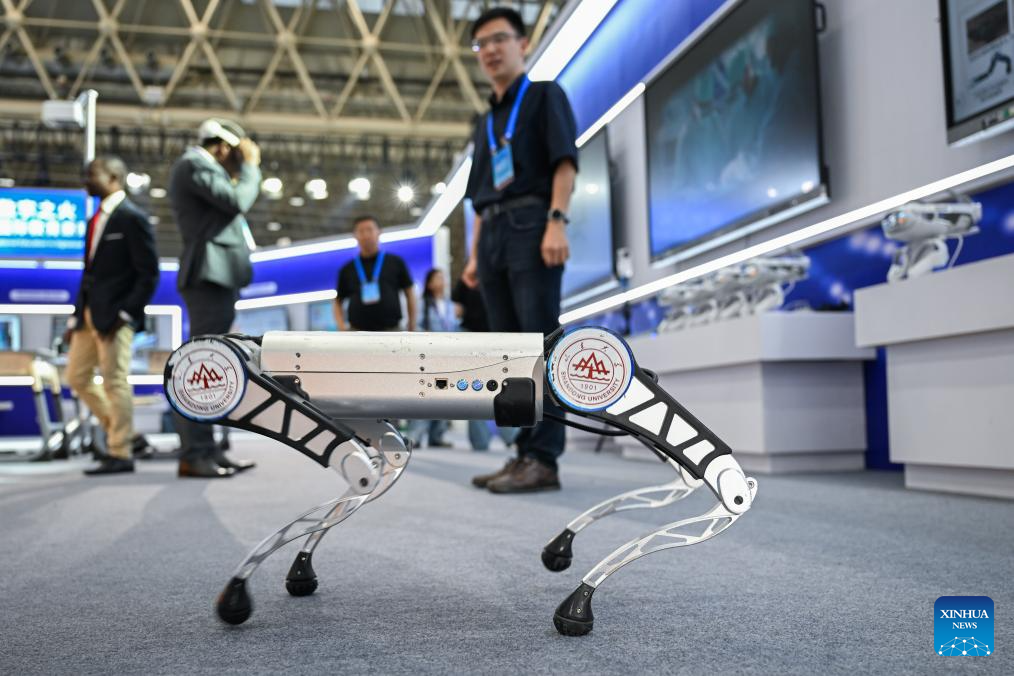 This photo taken on May 14, 2025 shows a robotic dog displayed at the Digital Education Achievements Exhibition of the 2025 World Digital Education Conference in Wuhan, central China's Hubei Province. Under the theme of "Education Development and Transformation: The Era of Intelligence," the 2025 World Digital Education Conference opened here on Tuesday. (Xinhua/Du Zixuan)