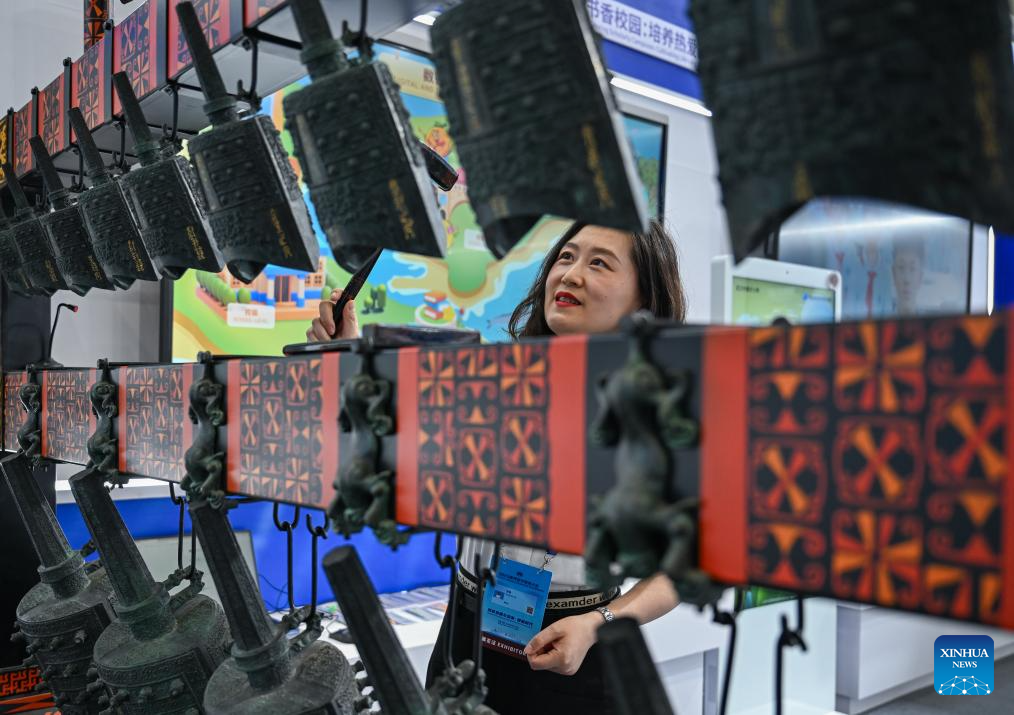 A visitor plays Bianzhong, a traditional Chinese percussion instrument set, at the Digital Education Achievements Exhibition of the 2025 World Digital Education Conference in Wuhan, central China's Hubei Province, May 14, 2025. Under the theme of "Education Development and Transformation: The Era of Intelligence," the 2025 World Digital Education Conference opened here on Tuesday. (Xinhua/Du Zixuan)