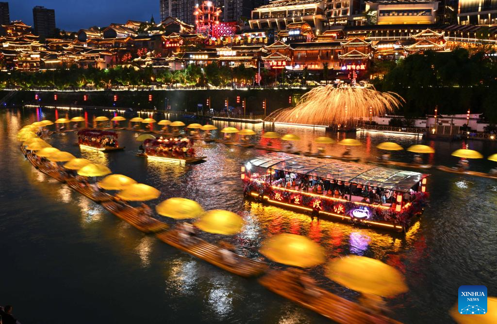 Tourists enjoy the night view along Gongshui River in Xuan'en County, central China's Hubei Province, June 1, 2025. People enjoy the 3-day holiday of the Dragon Boat Festival, also called Duanwu Festival which falls on May 31 this year, via various activities across the country. (Photo by Song Wen/Xinhua)