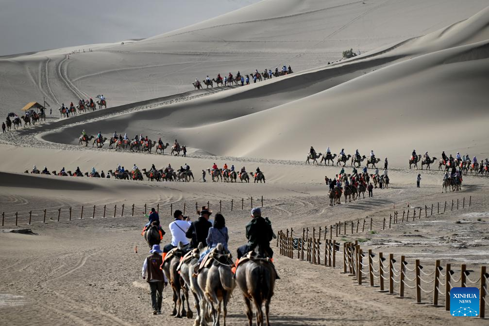 People ride camels at the Mingsha Mountain and Crescent Spring scenic spot in Dunhuang, northwest China's Gansu Province, June 2, 2025. People enjoy the 3-day holiday of the Dragon Boat Festival, also called Duanwu Festival which falls on May 31 this year, via various activities across the country. (Photo by Zhang Xiaoliang/Xinhua)