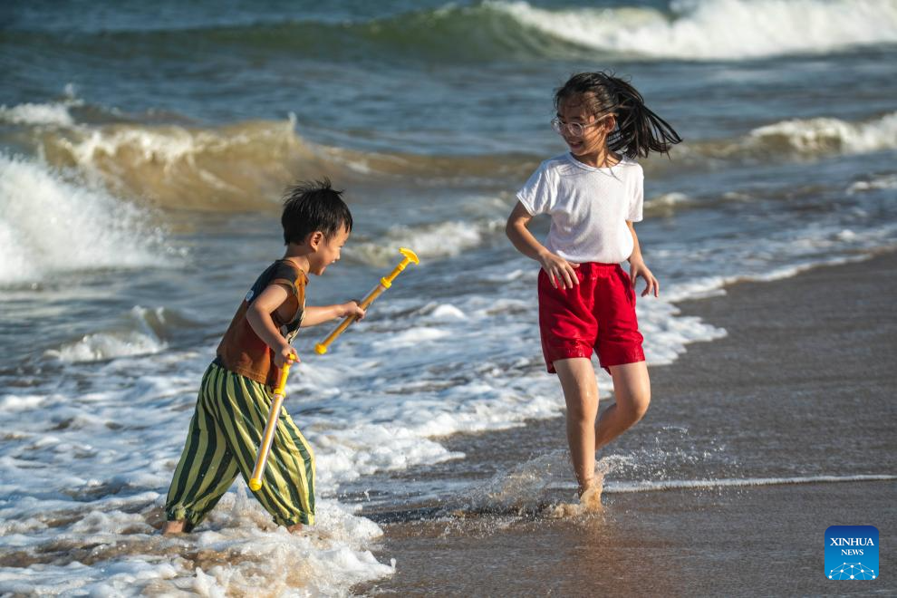 Kids play along the seashore in Boao, Qionghai City, south China's Hainan Province, June 2, 2025. People enjoy the 3-day holiday of the Dragon Boat Festival, also called Duanwu Festival which falls on May 31 this year, via various activities across the country. (Photo by Meng Zhongde/Xinhua)
