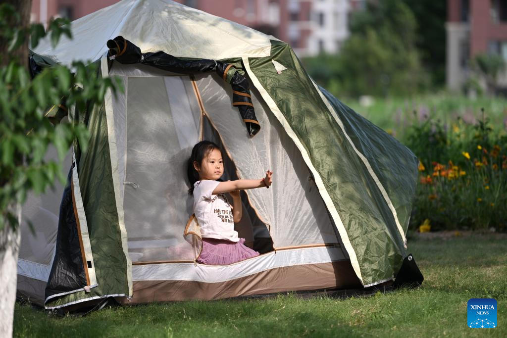 A kid has fun in a tent on a grassland in Zhongbei Town of Xiqing District, north China's Tianjin, June 2, 2025. People enjoy the 3-day holiday of the Dragon Boat Festival, also called Duanwu Festival which falls on May 31 this year, via various activities across the country. (Xinhua/Li Ran)