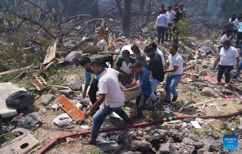 People conduct rescue work at the site of an Air India plane crash in Ahmedabad of India's Gujarat state, June 12, 2025. India's foreign ministry said a lot of people have lost their lives in the plane crash with 242 people on board the flight to London in the western state of Gujarat. (Str/Xinhua)