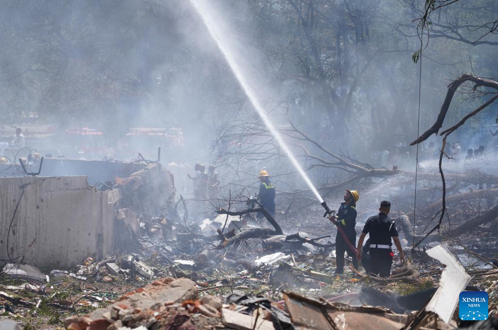 Firefighters extinguish flames at the site of an Air India plane crash in Ahmedabad of India's Gujarat state, June 12, 2025. India's foreign ministry said a lot of people have lost their lives in the plane crash with 242 people on board the flight to London in the western state of Gujarat. (Str/Xinhua)
