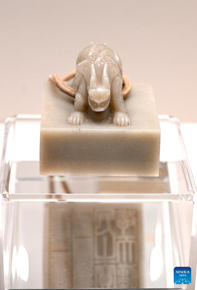 This photo taken on July 27, 2025 shows a seal displayed at an exhibition of seal carving art at the Forbidden City in Beijing, capital of China. An exhibition of seal carving art for the central axis of Beijing kicked off at the Forbidden City on Sunday, showcasing 200 pieces of seal carving artworks and 20 imperial seals from the Qing Dynasty (1644-1911). (Xinhua/Jin Liangkuai)