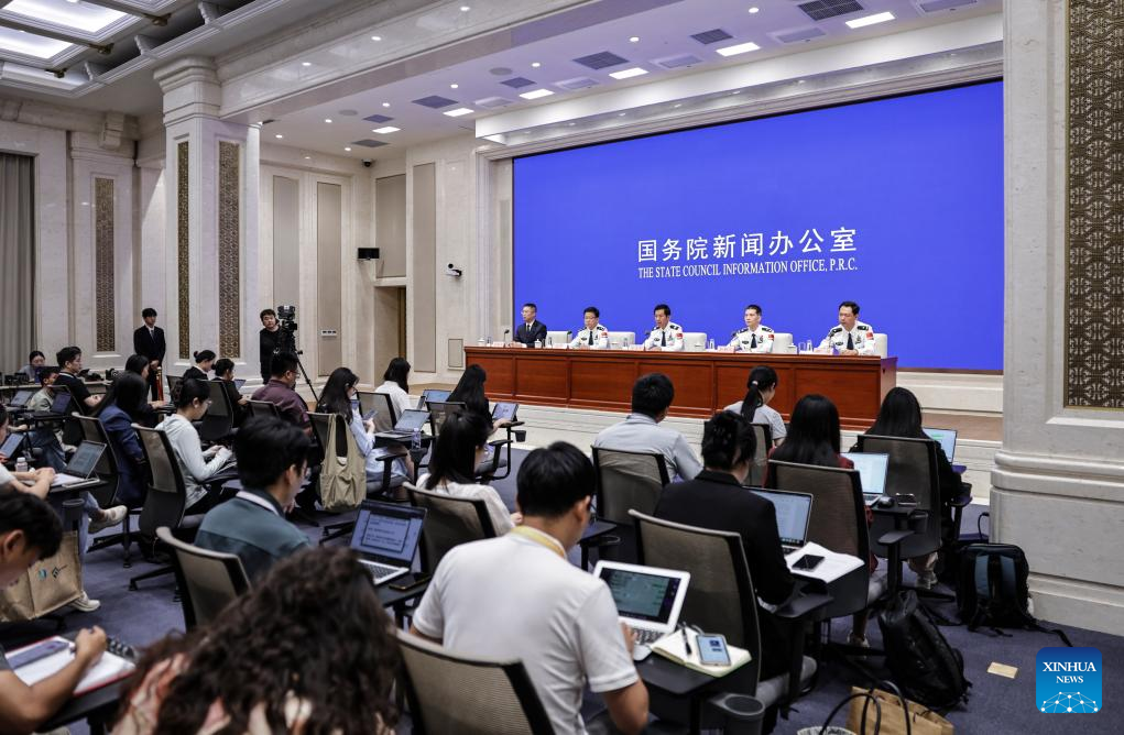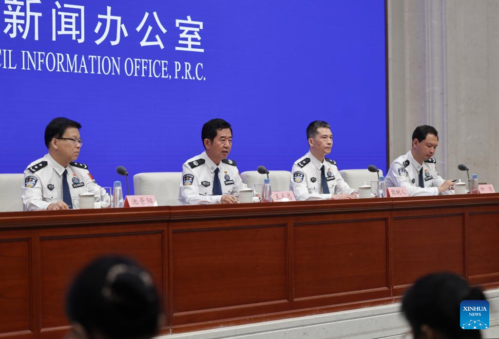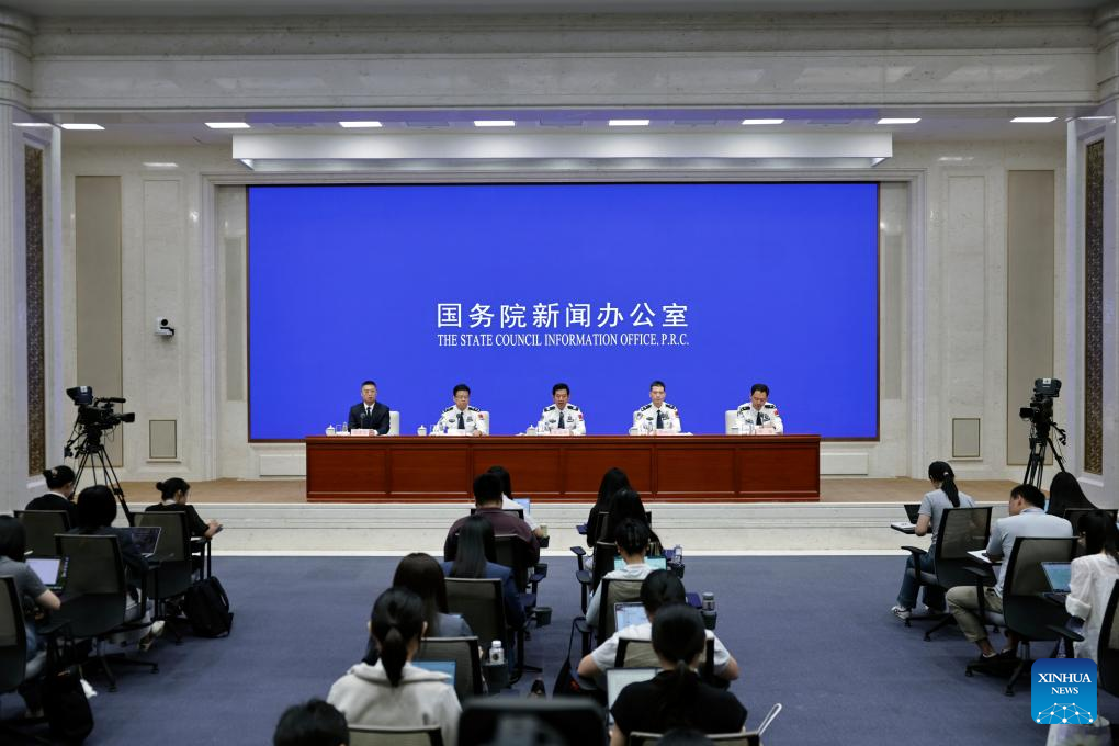 Wang Zhizhong, vice minister of public security and head of the National Immigration Administration (NIA), speaks during a press conference held by the State Council Information Office (SCIO) on China's immigration management achievements during the 14th Five-Year Plan period (2021-2025) in Beijing, capital of China, July 30, 2025. Wang and NIA officials Xiong Shuren, Chi Jingyang and Liu Jia, attended the press conference in Beijing on Wednesday. (Xinhua/Zhang Yuwei)
