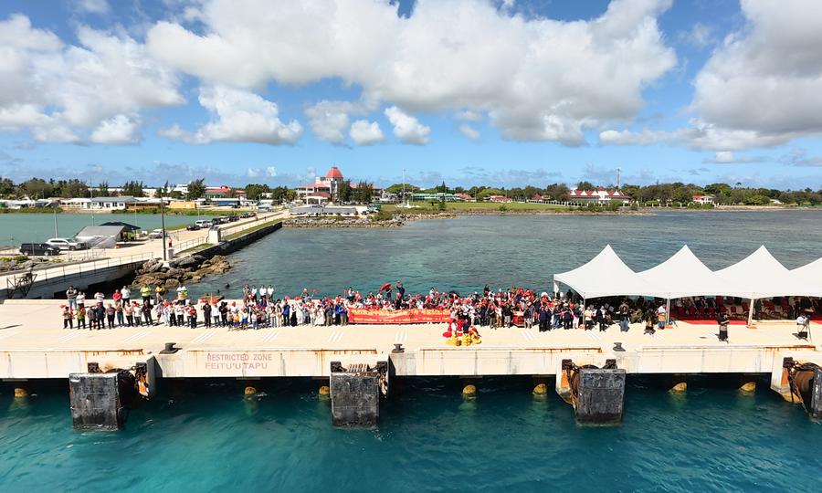 This photo taken on Oct. 13, 2025 shows the welcome ceremony for the Chinese naval hospital ship, Silk Road Ark, at Nuku'alofa Port in Tonga. (Photo by Wang Junchuan/Xinhua)