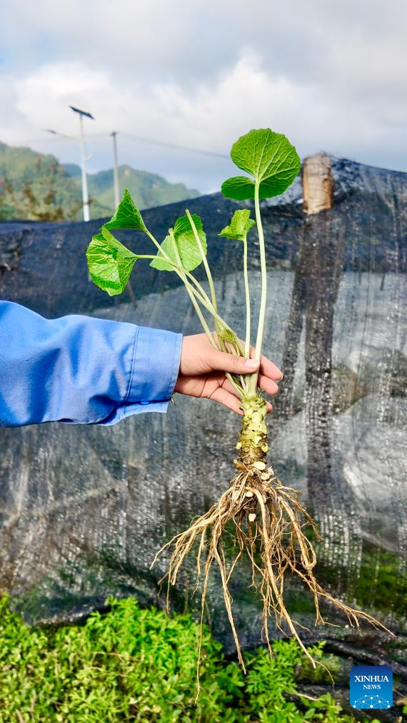 A worker shows a wasabi plant at a wasabi base in Weixin County, southwest China's Yunnan Province, Oct. 23, 2025. (Xinhua/Wang Xiansi)