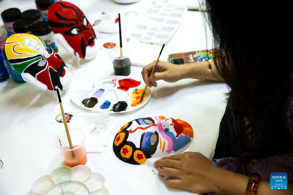 Visitors paint Chinese opera masks during a traditional Chinese paper-cutting exhibition at the China Cultural Center in Yangon, Myanmar, Nov. 5, 2025. A traditional Chinese paper-cutting exhibition was held at the China Cultural Center in Yangon on Wednesday. (Xinhua/Myo Kyaw Soe)