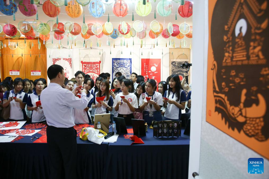 Students learn Chinese traditional paper-cutting during a traditional Chinese paper-cutting exhibition at the China Cultural Center in Yangon, Myanmar, Nov. 5, 2025. A traditional Chinese paper-cutting exhibition was held at the China Cultural Center in Yangon on Wednesday. (Xinhua/Myo Kyaw Soe)