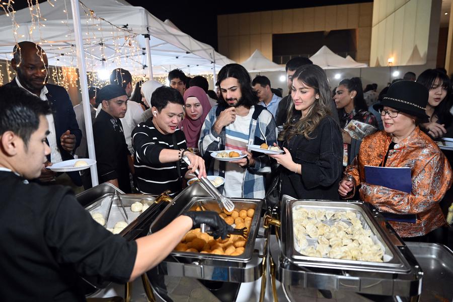 People enjoy Chinese food during the Chinese culture night event at the Chinese Embassy in Kuwait in Hawalli Governorate, Kuwait, Nov. 26, 2025. (Photo by Asad/Xinhua)